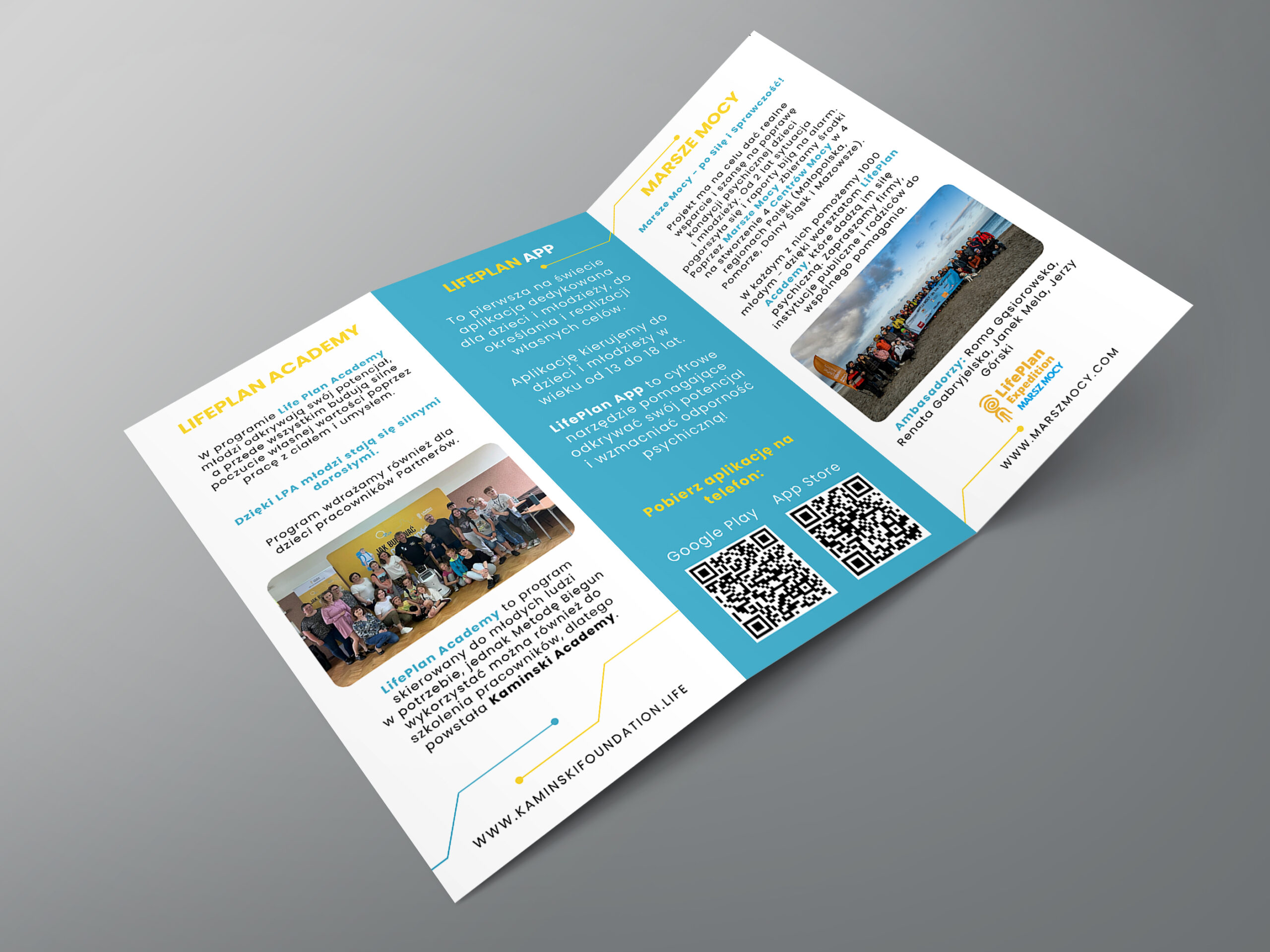 Miałyśmy przyjemność zaprojektować broszurę informacyjną dla Fundacji Marka Kamińskiego. Miała format A4 i składała się z 6 kolumn. Składana była w formie tzw. harmonijki. Projekt przygotowałyśmy we dwie – Zuzia i Karolina. Do projektu wykorzystałyśmy kolorystykę obecną na stronie fundacji, zdjęcia z wydarzeń, ale także kilka nowoczesnych elementów. Zamysł był taki, że każdy panel opisuje oddzielny projekt. Czasu miałyśmy bardzo mało, ale udało się zdążyć i wyszło całkiem fajnie 🙂
